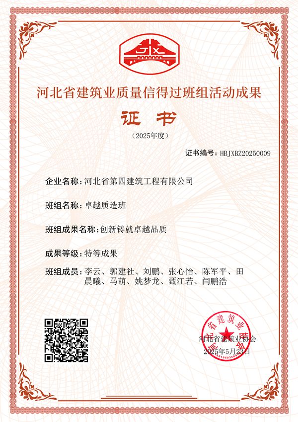 5月25日,三分公司收到河北省建筑业协会关于2025年度河北省建筑业质量信得过班组活动结果的通报,由分公司“卓越质造班”班组完成的“创新铸就卓越品质”成果,被评为“特等成果”。