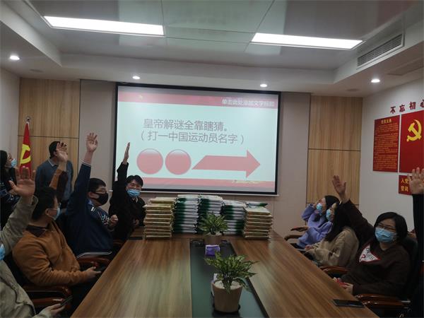 “正月十五贴对联,打一北京冬奥比赛场地。”大屏幕刚一翻开,职工们纷纷参与竞答,司南第一个站起来说:“是崇礼”,梁靖昆马上跟上说:“你说的不对,应该是延庆”,组织者说:“梁靖昆答对了,发奖品”。“说上两句赶紧溜,打一冬奥比赛项目。”只见李天昊站起来说:“是短道速滑,2月7日,任子威获得了北京冬奥会短道速滑男子1000米冠军,实现了中国队在该项目上冬奥金牌零的突破。看我这大长腿,也非常适合这个项目。”大家哄然大笑。“答对了,发奖品。”随着奖品的不断发放,大家的热情更高了,展开了更加激烈的角逐,活动现场精彩纷呈、高潮迭起,充满了活力和趣味。活动结束后,组织人员还为每名职工发放了汤圆。